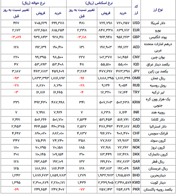 نرخ سایر ارزها و تغییرات آن به تفصیل در جدول زیر آمده است.