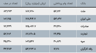 نکته قابل توجه آن است که ۶ بانک ملت، ملی ایران، صادرات، تجارت، سپه و رفاه کارگران بیش از سه چهارم این بار را بر دوش گرفتهاند.